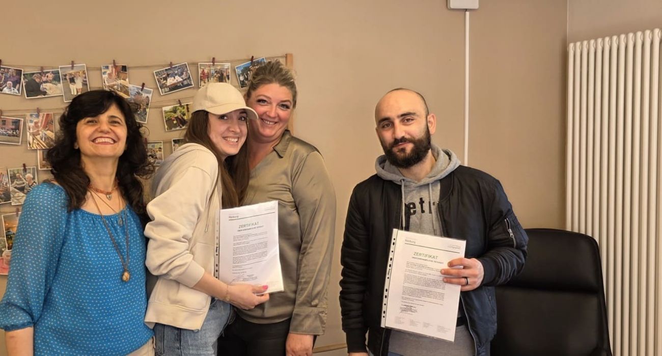 Mit einem großen Herz für ältere Menschen und einer noch größeren Portion Engagement haben sich Areej und Moaweia in den letzten Monaten in der Seniorenresidenz Harburg einen besonderen Moment verdient: Jolanta, Mitarbeiterin der Seniorenresidenz überreichte ihnen ein Zertifikat und ehrte damit ihren Einsatz.